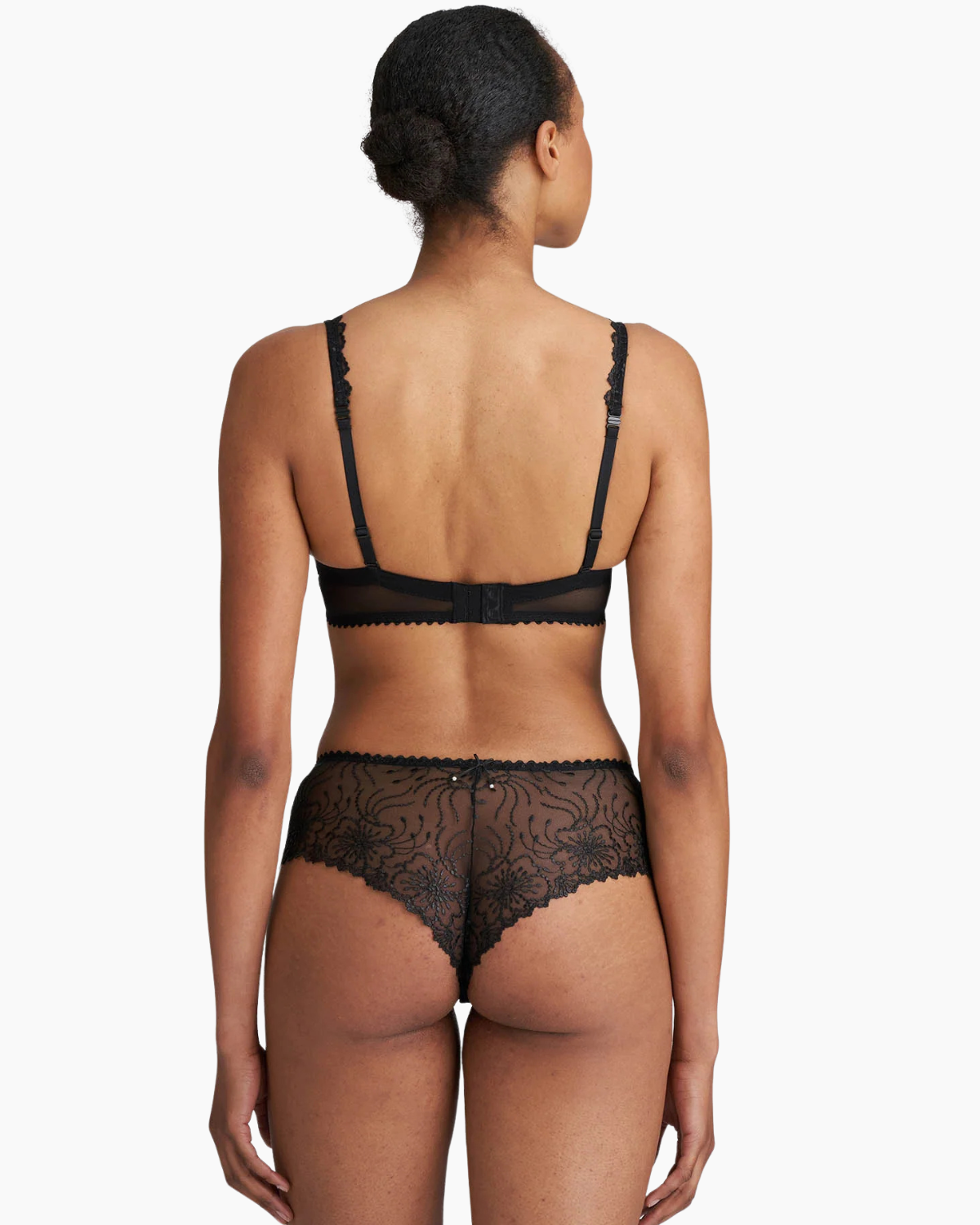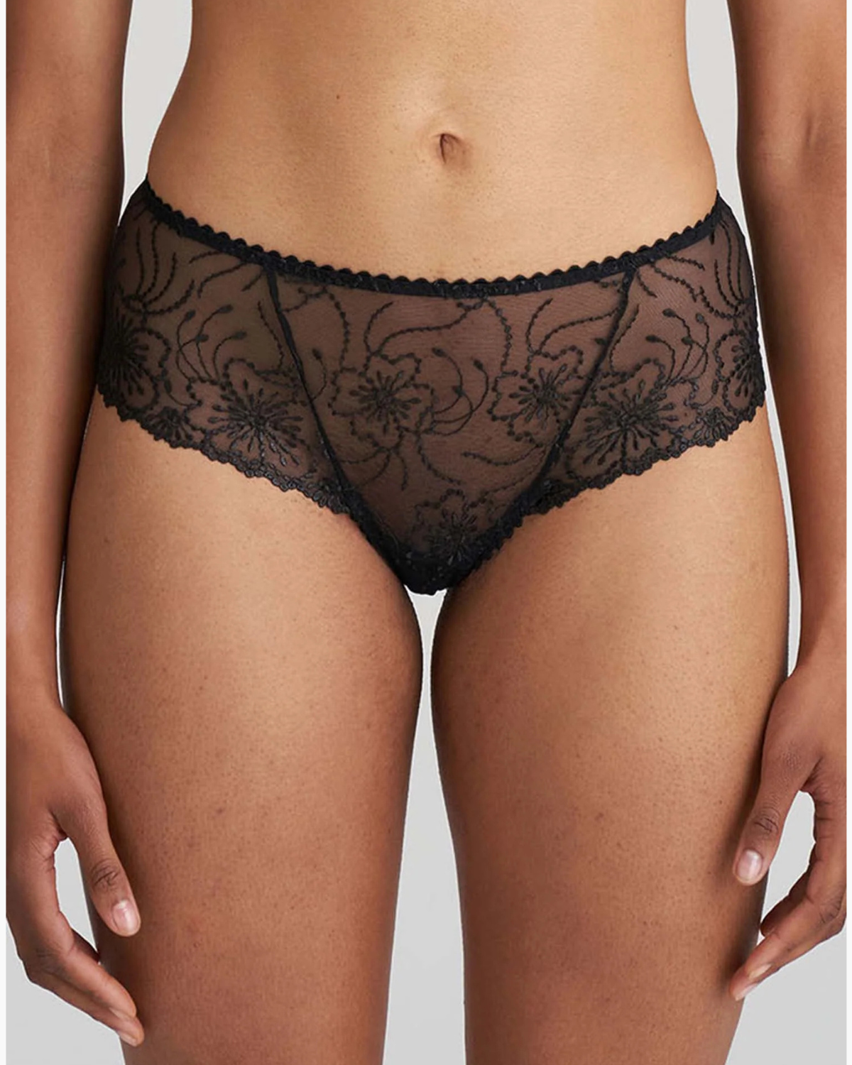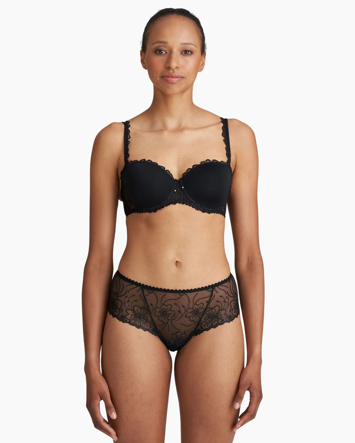 MARIE JO Jane Luxury Thong offers a beautifully seductive design crafted from lightweight tulle and elegant embroidery. Wider at the front, this design also offers partial coverage in the back. Pair with the Marie Jane Push Up Bra in Black for the perfect foundation for a stylish winter look.